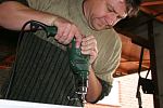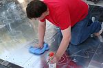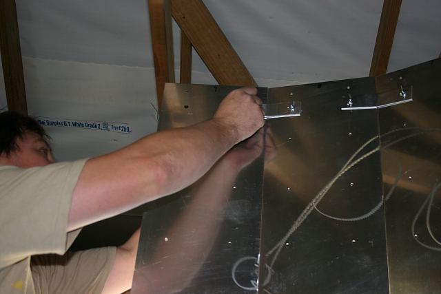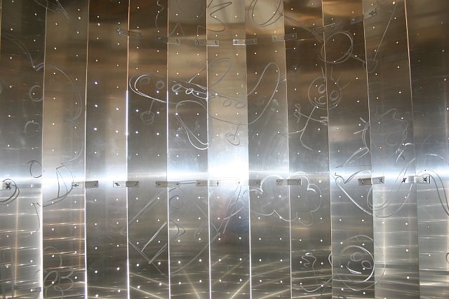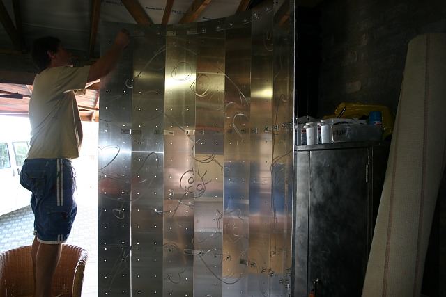 The work is designed to mesmerise the viewer, through the use of the shiny aluminium panels in a circle. Trapping you in your version of a safe world, your own back garden on a summer day.