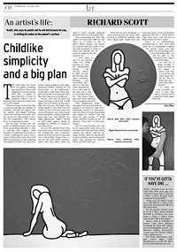 The artist dips his brush into the palette, scooping up a big lick of colour and slapping it onto the canvas with glee. A splash of shocking blue; a burst of sunshine yellow; a jolt of blinding Arctic white, the colour that isn’t even a colour. The artist lets go of the brush, like a caveman resisting the impulse of evolution. He jabs his fingers into the palette, and begins daubing colour onto the floor and walls, as if the canvas isn’t big enough to con-tain his imagination. Meet Richie Scott, 3, contemporary artist. He has been invited into the studio, in Melkbosstrand, near Cape Town, by his father, Richard, 37, who is working with slightly more restraint on a painting of a woman in a bikini, outlining her curves with a series of fluid black lines that lend flesh and substance to the numbing nothingness of white. ”Ja,” says Scott.