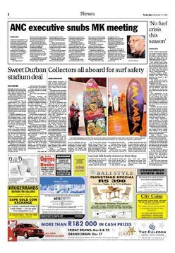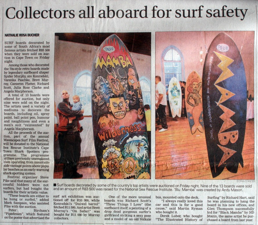 Peter Bircham's "Pipedream", which featured on the poster that advertised the surf art exhibition was auctioned off for R10 000, while Konradski's "Duiwel barrel" fetched R11 500. And artist Brett Murray's "On Safari" was bought for R11 000 by Murray collectors.