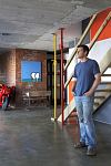 A perforated metal window in the wooden floor above provides a porthole into the wine cellar and the small Workman's Bench in the dining room features a pair of workman's boots as supports.